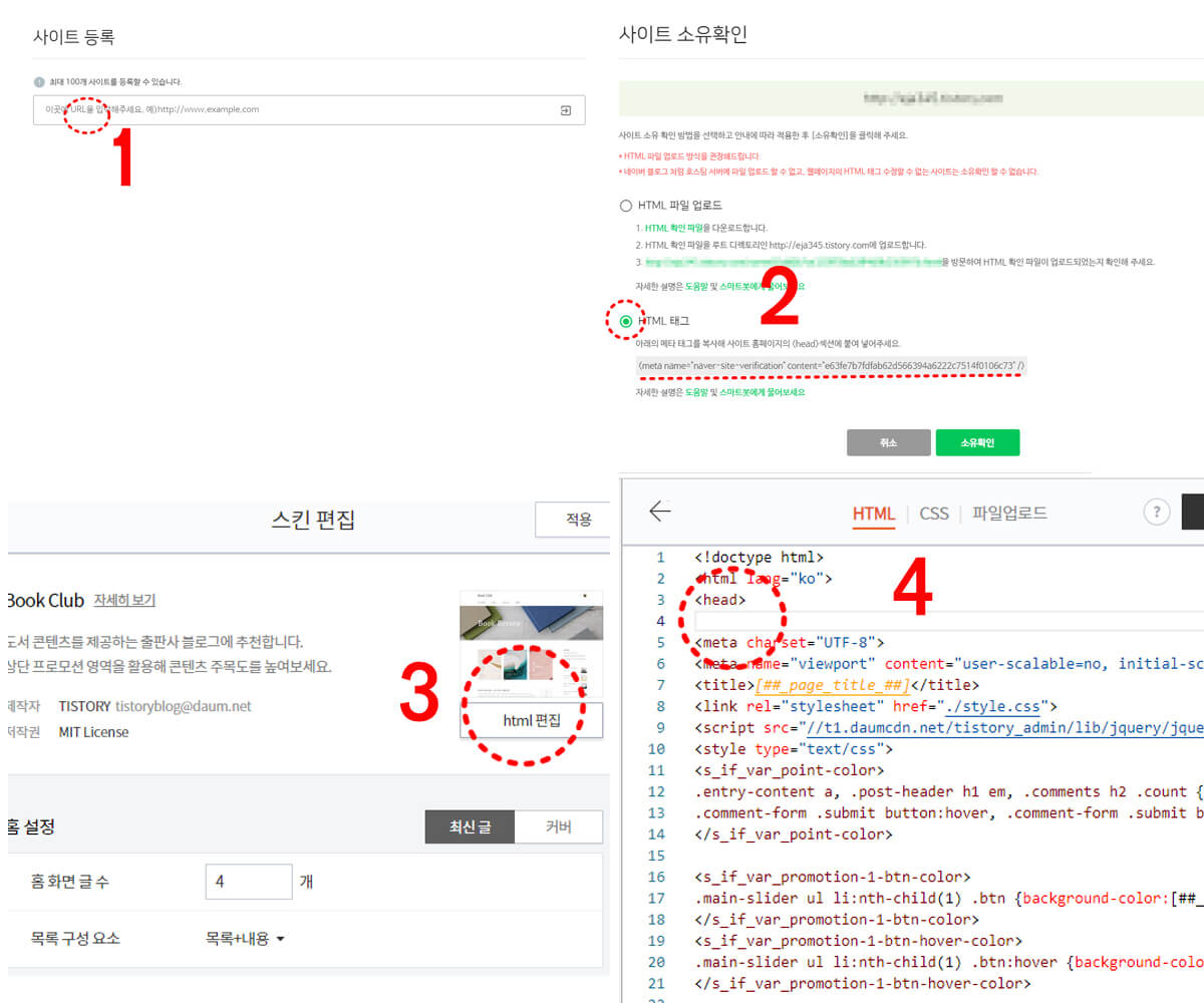 네이버 등록은 조금 복잡해서 어려워하시는 분들이 많습니다. 우선 '네이버 서치어드바이저'라는 곳에 가입을 하셔야 합니다. 가입하고 로그인하면 우측 상단에 웹마스터 도구 클릭, 사이트 등록에 본인의 주소 입력 후 우측 화살표 클릭하세요. 사이트 소유확인이라는 페이지가 나오는데 2가지 방법 중에 HTML 탱크 방법이 더 간단한 것 같아요. 체크 후 메타 테크를 복사하고 동록 할 자신의 블로그로 이동 (티스토리로 예를 들겠습니다) 스킨편집에 들어가서 우측에 보시면 HTML 클릭 뭔가 복잡해 보이고 난감한 영어가 나오는데 당황하지 말고 위쪽에 head 부분을 찾으세요. 찾으시고 엔터를 치신 후 아래에 복사한 메타 태그를 넣으시고 적용을 누르시면 완료입니다. 그럼 다시 서치어드바이저로 넘어오셔서 소유확인을 누르시면 모든 절차가 완료됩니다.
