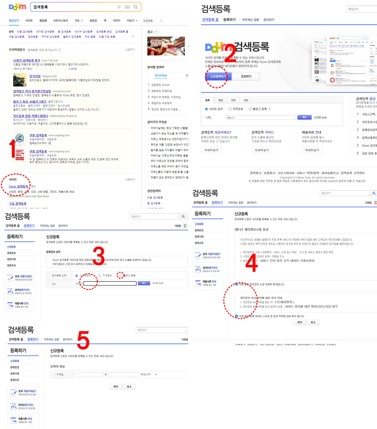 다음 역시 '검색등록'이라고 치면 나오는 다음 검색등록 클릭, 신규등록하기 누르고 블로그 등록을 체크 등록할 사이트 주소를 입력 후 확인, 정보 수집 동의에 체크 후 확인 누르면 등록자 정보로 메일 주소 입력이 나옵니다. 주로 사용하시는 메일로 입력하고 확인 누르면 완료.