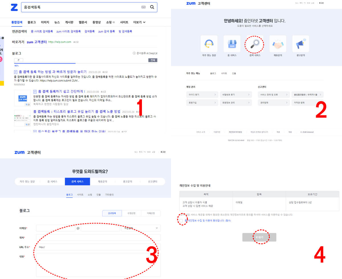 줌 사이트에 들어가서 '줌 검색 등록'이라고 치면 줌 고객센터 바로가기가 나옵니다. 고객센터 클릭해서 들어가서 검색서비스 탭을 클릭, 이후 나오는 이메일, 제목 등 해당 부분에 입력을 하고 아래 필수 항목 동의 체크 후 보내기 누르면 완료. 첨부파일은 패스하셔도 됩니다. 바로 등록이 되는 것이 아니라 1~3일 걸린다고 합니다.